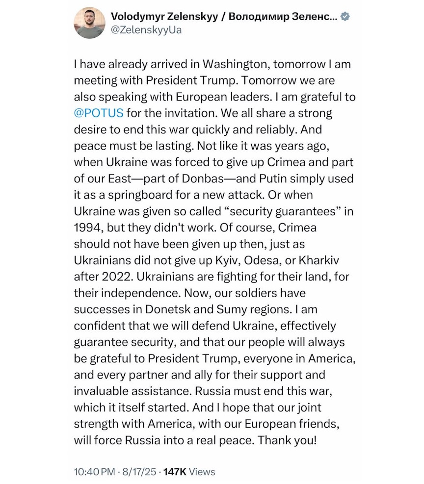 IMAGE: Zelenskyy tweet from Aug 17, 2025.