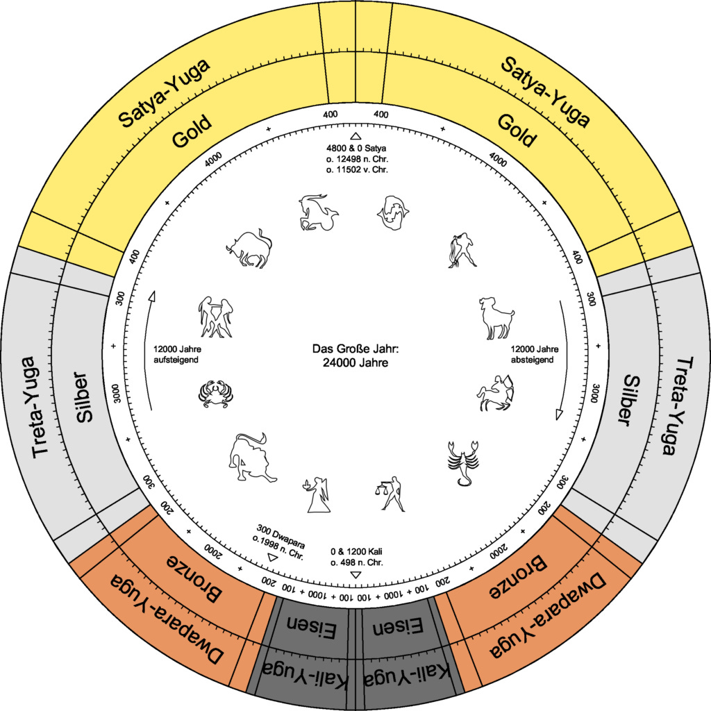 Early 20th century Hindu teacher, Sri Yukteswar believed this multi-million-year-long cycle was a miscalculation and that the total cycle was of only 24,000 years, with both descending and ascending ages, like this: