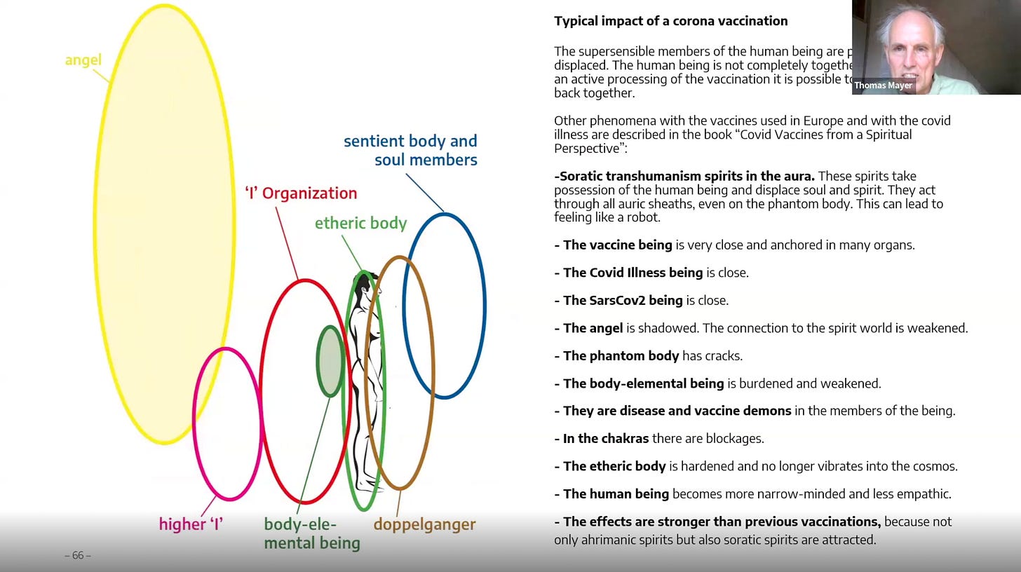 Fifty separate Anthroposophic "supersensitive" investigators all found that the COVID shots used in Europe damaged the auric sheaths of humans beings and caused the separation of the physical and etheric bodies from the soul and spirit, enabling demonic spirits to take possession of human beings, displacing their souls and spirits.