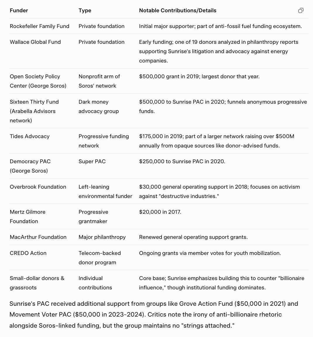 TABLE: Key funders of the Sunrise Movement, courtesy of Grok.